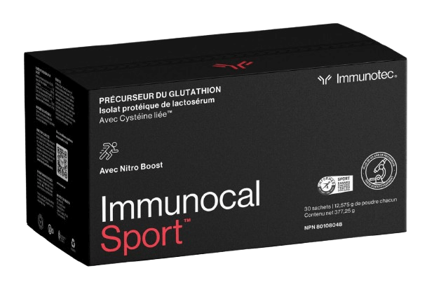 Offert en boîte de 30 sachets hermétiquement scellés pour préverver sa bioactivité, IMMUNOCAL présente la valeur biologique la plus élevée de toutes les protéines et est même reconnue par Santé Canada pour aider au maintien d’un système immunitaire fort.