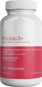 Probio 3+ est le seul probiotique à contenir 7 souches probiotiques, un prébiotique et un extrait de canneberge riche en antioxydants, qui agissent ensemble pour équilibrer la santé intestinale, si importante pour votre bien-être optimal.
