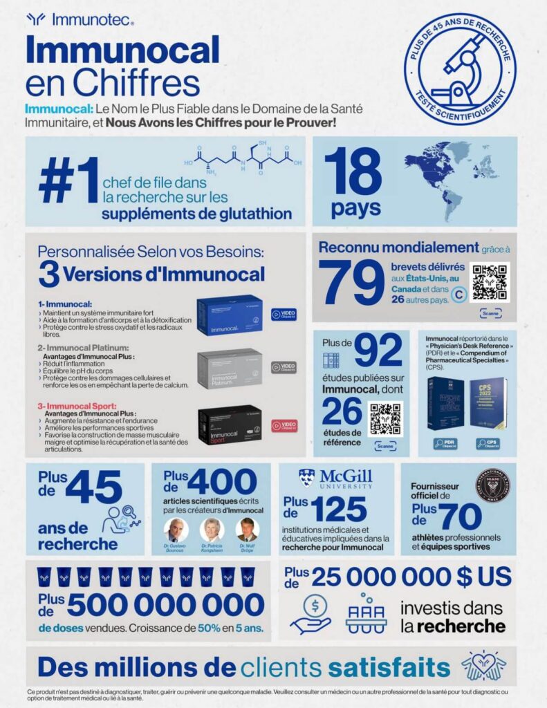 Avec sa découverte Immunocal et sa version Platinum qui ont l’avantage d’être les seules soutenues par des études cliniques démontrant leur efficacité, le leader et l’icône mondiale du segment immunitairedu monde du mieux-être offre des suppléments uniques et prouvés scientifiquement, et dont tous ont besoin pour garder le plus précieux bien qui soit, LA SANTÉ.