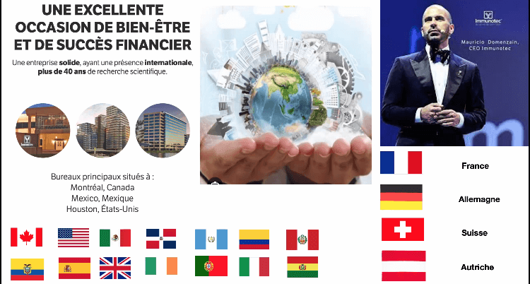 Bref, IMMUNOTEC constitue plus que jamais une extraordinaire opportunité internationale. En devenant consultant indépendant dans l’un des 18 pays où l’entreprise est déjà en force et en pleine action, on peut faire équipe avec des partenaires et y développer des affaires florissantes, grâce à un puissant système CLÉS EN MAIN.